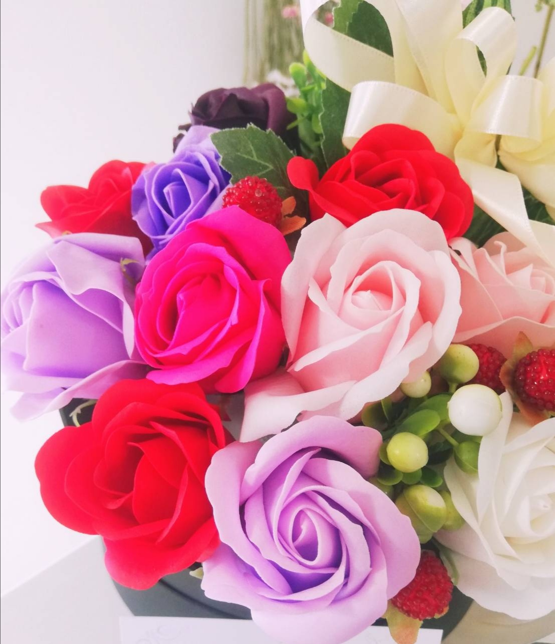 ソープフラワーをオシャレなラウンド型BOXにアレンジしました。