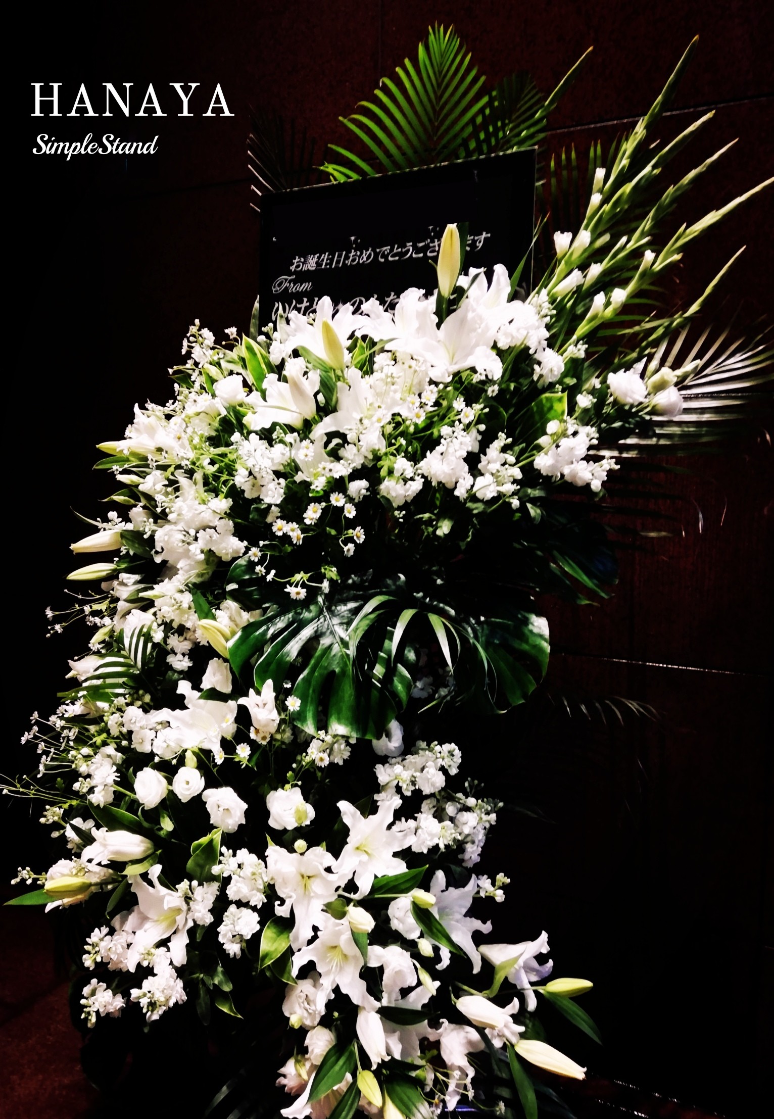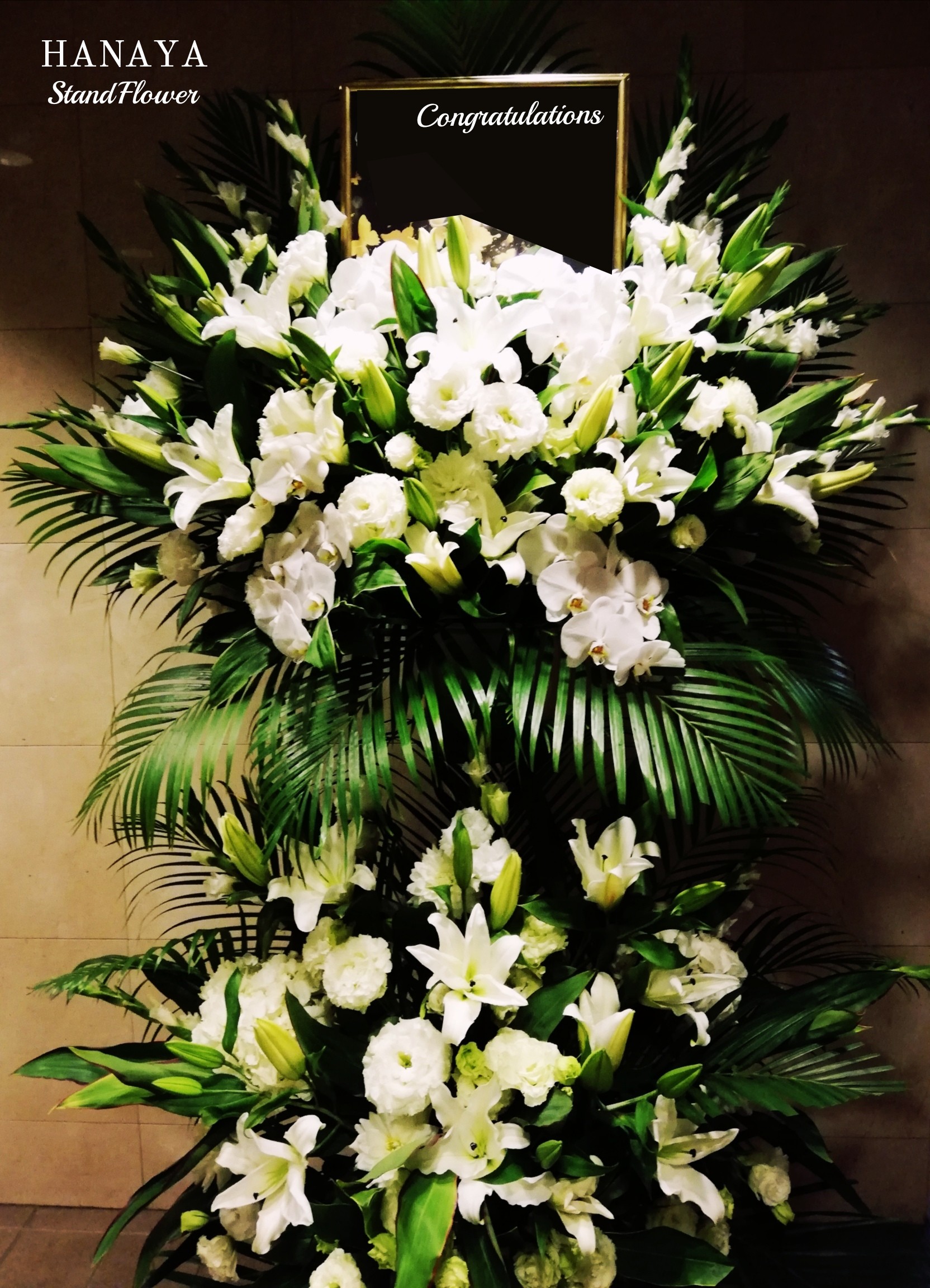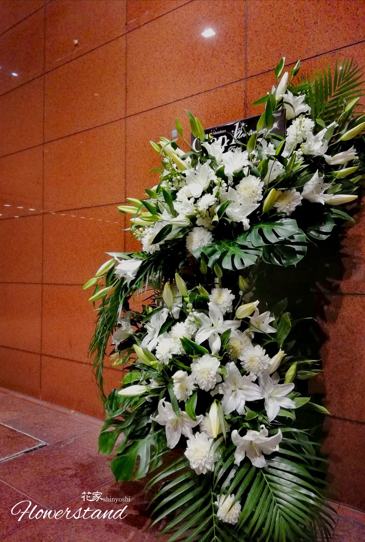 フラワースタンド 当店で通常御提供させて頂いている、スタンドスタイルです。 ホワイト&グリーンの一番人気色。 爽やかな色彩ですがデザインされたスタンドの為、御祝の席などにも十分な華やかさを演出致します。 もちろん、ピンク系・赤系・青系・紫系・ミックス系など様々な色の御指定可能です。 指定色によっては、表示価格を上回るものがございます。 お気軽にお問い合わせ下さいませ。